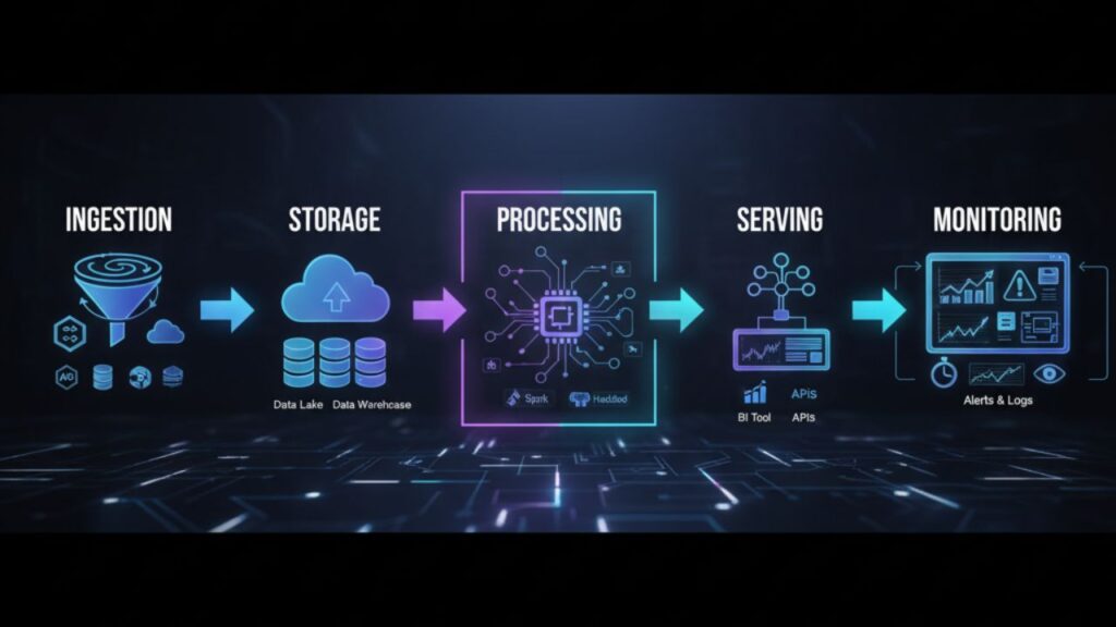 1. Ingestion: Collecting data from sources (databases, APIs, IoT, logs).